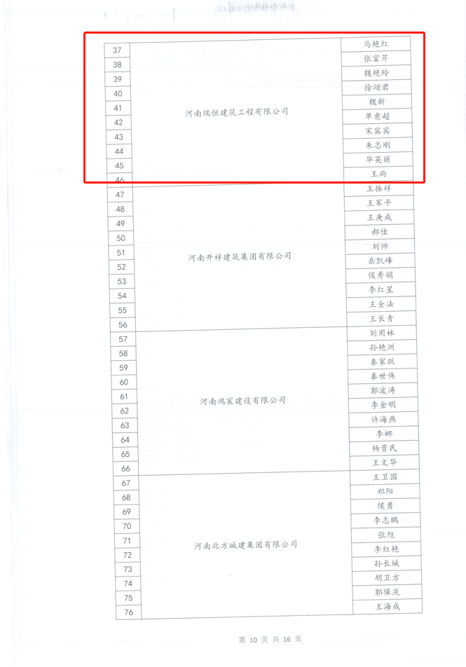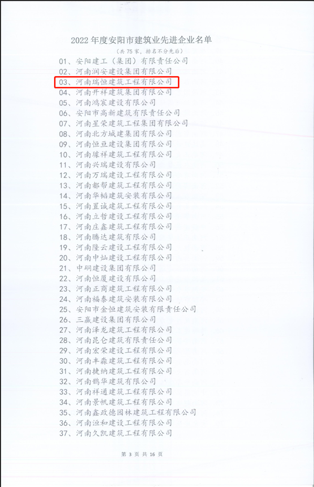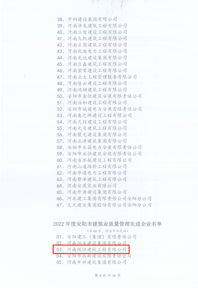 安陽市建筑業協會、安陽市建設安全管理協會、安陽市建設工程質量監督與檢測協會聯合公布“2022年度安陽市建筑業先進單位、優秀項目經理(建造師)”的通知,河南瑞恒建筑工程有限公司再次榮獲2022年度“安陽市建筑業先進企業”、“安陽市建筑業安全管理先進企業”、“度安陽市建筑業質量管理先進企業”和數名優秀項目經理,我司建造師馬艷紅、張富芹、魏艷玲、徐翊君、魏新、單意超、宋賓賓、朱志剛、華英麗、王雨等十人也榜上有名。