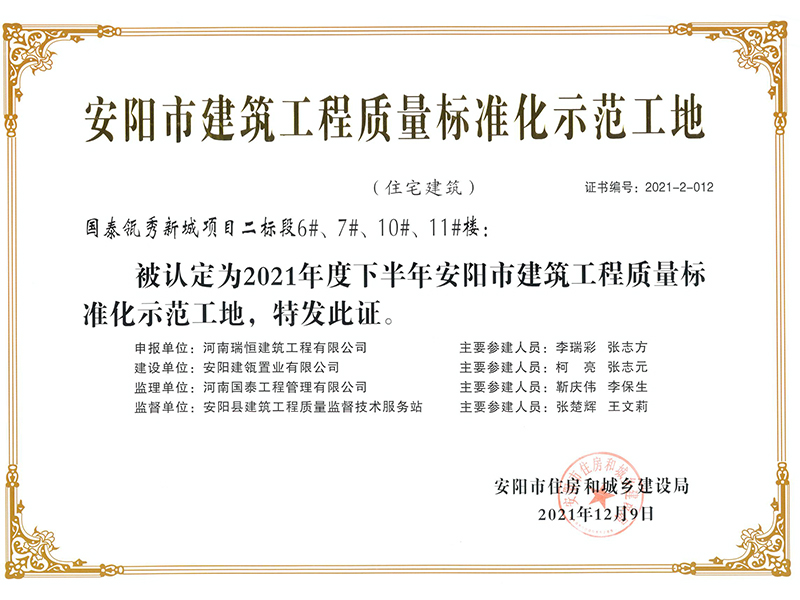 國(guó)泰瓴秀新城二標(biāo)段項(xiàng)目被評(píng)定為市建筑工程安全文明標(biāo)準(zhǔn)化示范工地