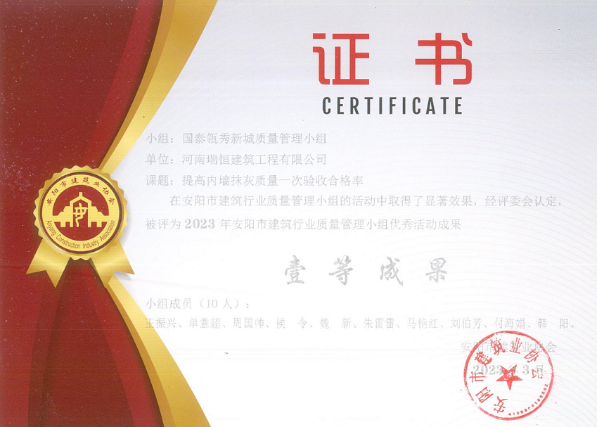 近日,公司國泰瓴秀新城項目申報的《提高樓層混凝土樓板施工質量一次驗收合格率》和《提高內墻抹灰質量一次驗收合格率》兩項QC成果榮獲2023年度安陽市建筑行業質量管理小組優秀活動成果。
